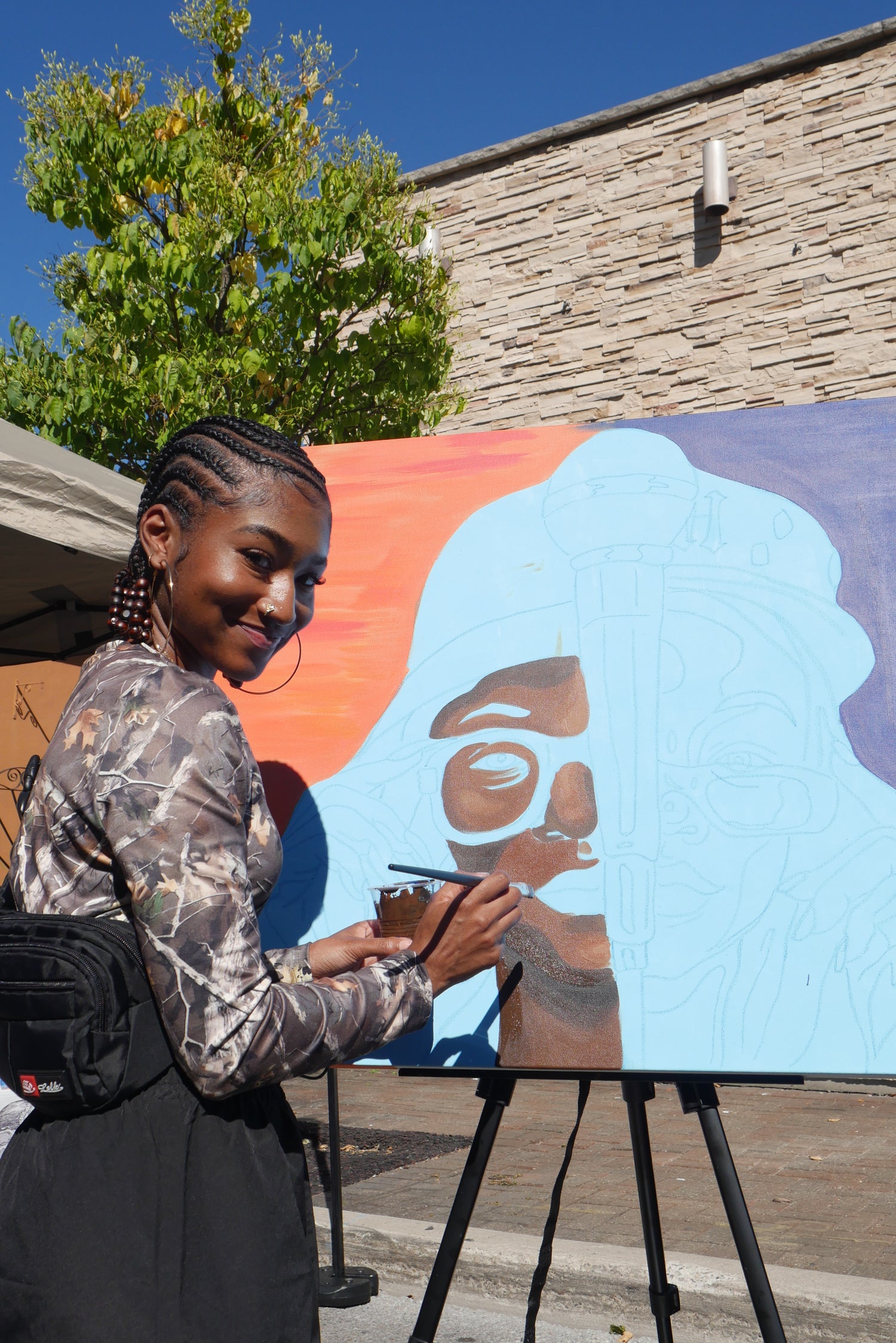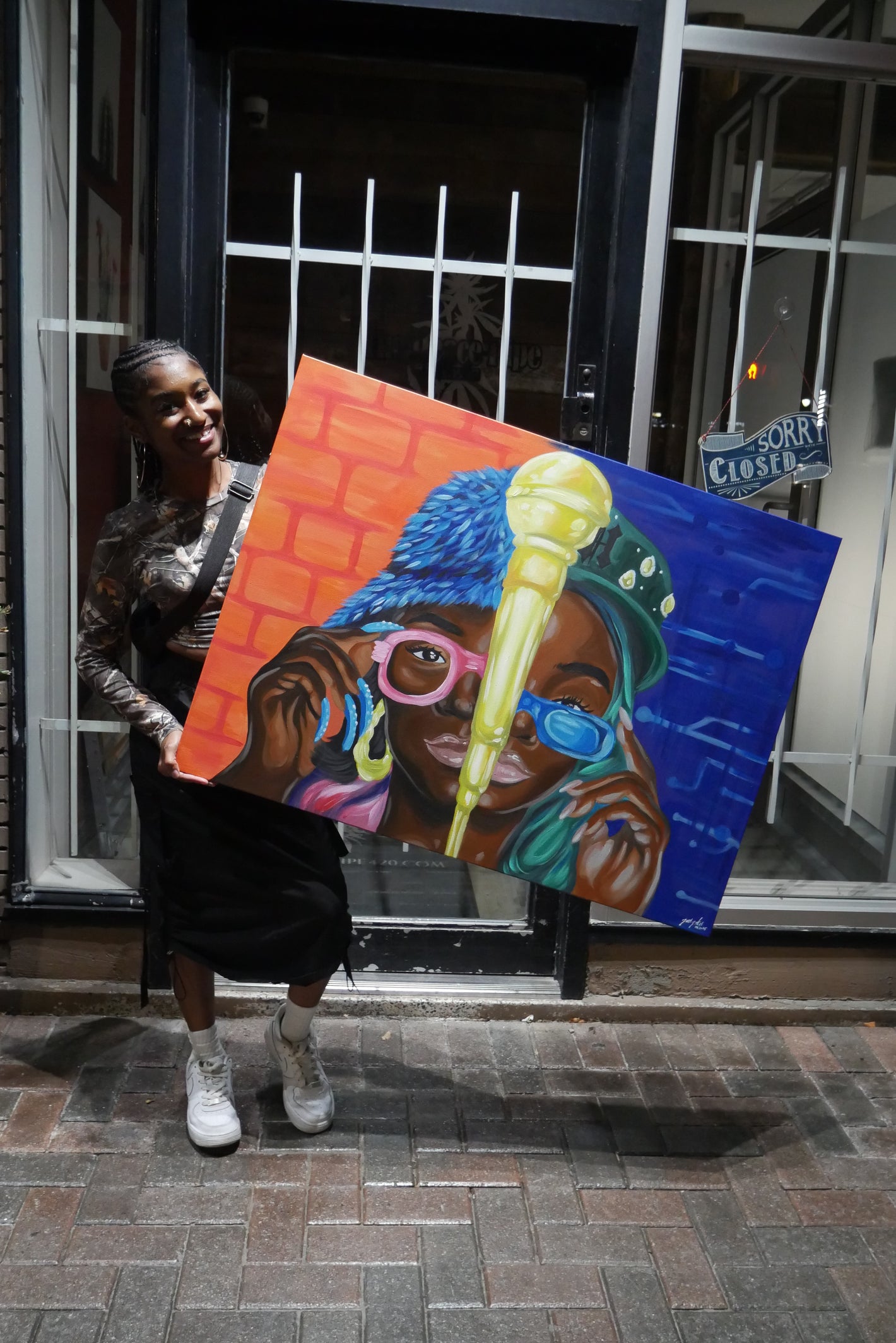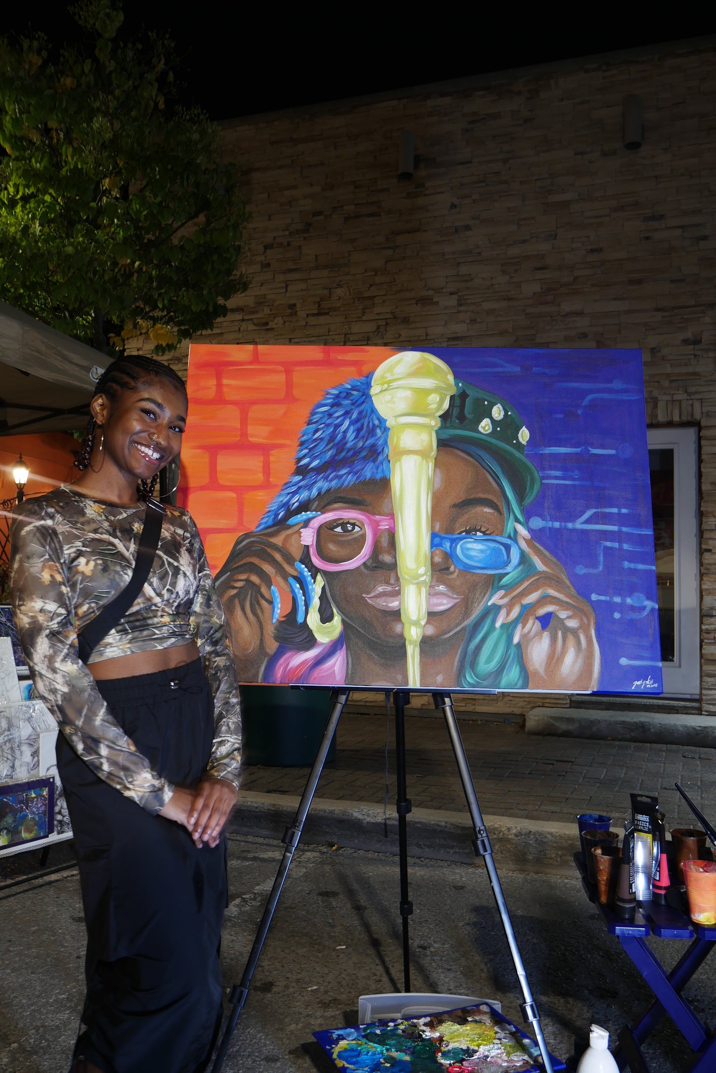 A portrait expressing hip hop through fashion from the past and present, projecting to possibilities of the future. The mic is at the centre to hone in on the message and values that hip hop speaks through words which then manifest into other pillars in life. On the left is the past, which will be expressed through old school fashion and an "alleyway like" background. On the right, hip hop is expressed through the fashion of today and a background that has tech features representing the future possibilities. The two sides are also like night and day, we need to recognize both, or rather all three for balance, recognition of roots, and continued evolution.